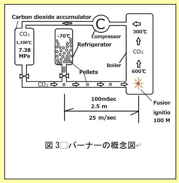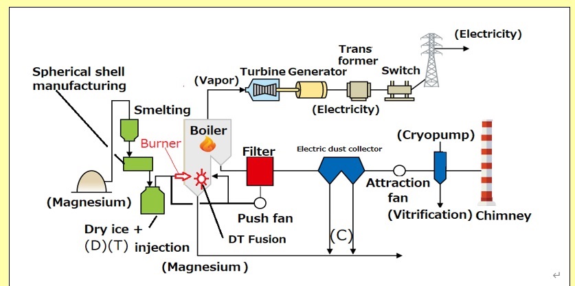 核融合発電所は石炭微粉炭火力発電所をベースに石炭微粉炭の代わりに核融合ペレット(球殻)DT(図3)またはDD(図4)または(図5)を燃焼させます。バーナー(図1)により二酸化炭素のボイラー(図2)に投入しその核融合から発生した熱が蒸気タービンを回して電力を得ます。建設費は現状の原発と火力発電所の間と見込みました。電力の製造単価は材料代(マグネシウムとCO2)と燃料費(DT)の費用からKwhあたり1円と試算しました。 |